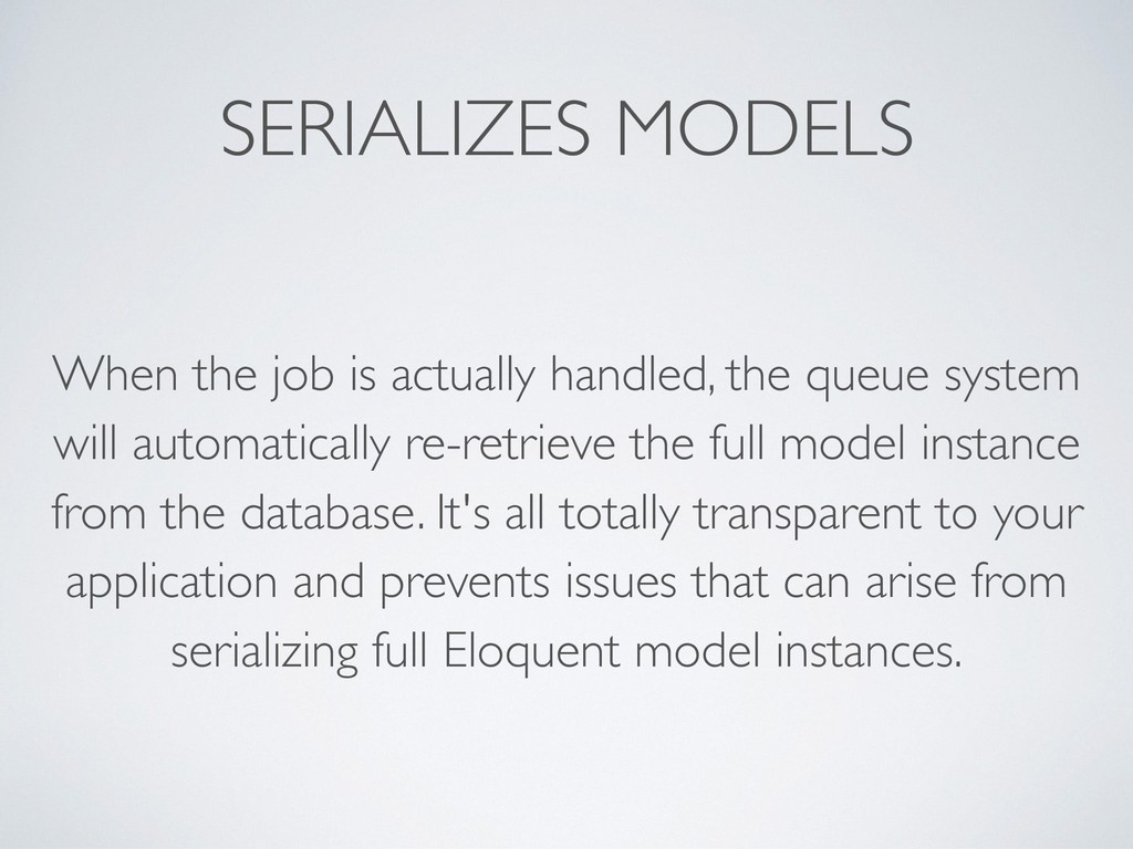 system will automatically re-retrieve the full model instance from the database. It's all totally transparent to your application and prevents issues that can arise from serializing full Eloquent model instances.