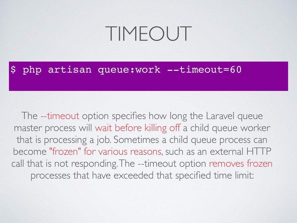 how long the Laravel queue master process will wait before killing off a child queue worker that is processing a job. Sometimes a child queue process can become "frozen" for various reasons, such as an external HTTP call that is not responding. The --timeout option removes frozen processes that have exceeded that specified time limit:
