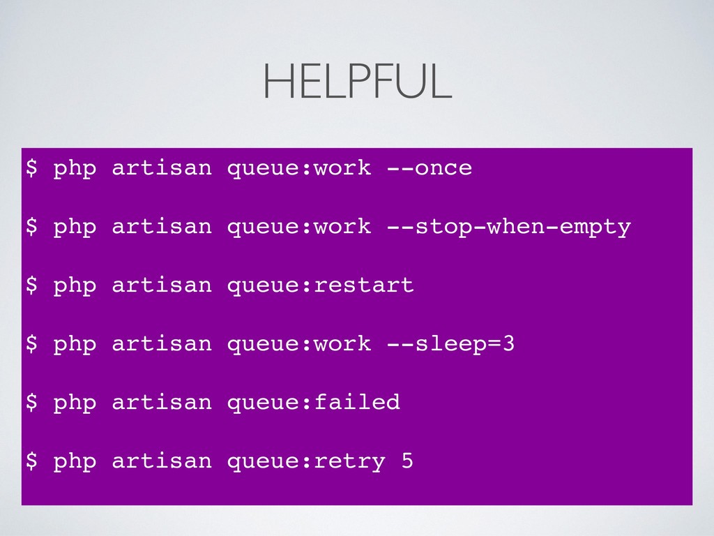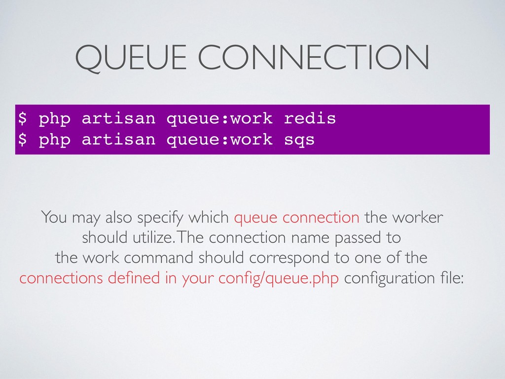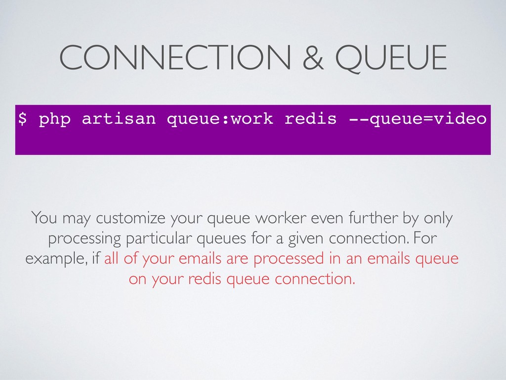 may customize your queue worker even further by only processing particular queues for a given connection. For example, if all of your emails are processed in an emails queue on your redis queue connection.