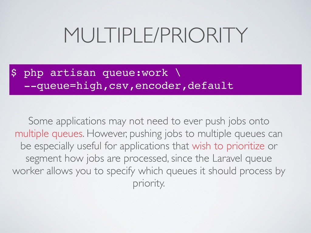 not need to ever push jobs onto multiple queues. However, pushing jobs to multiple queues can be especially useful for applications that wish to prioritize or segment how jobs are processed, since the Laravel queue worker allows you to specify which queues it should process by priority.