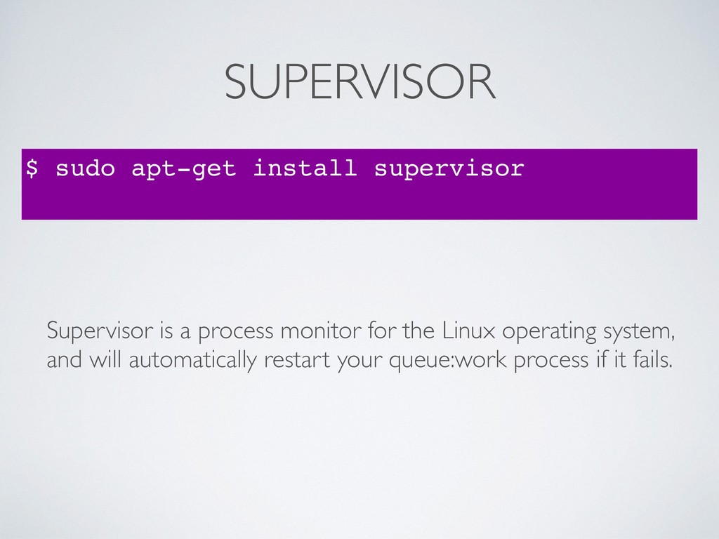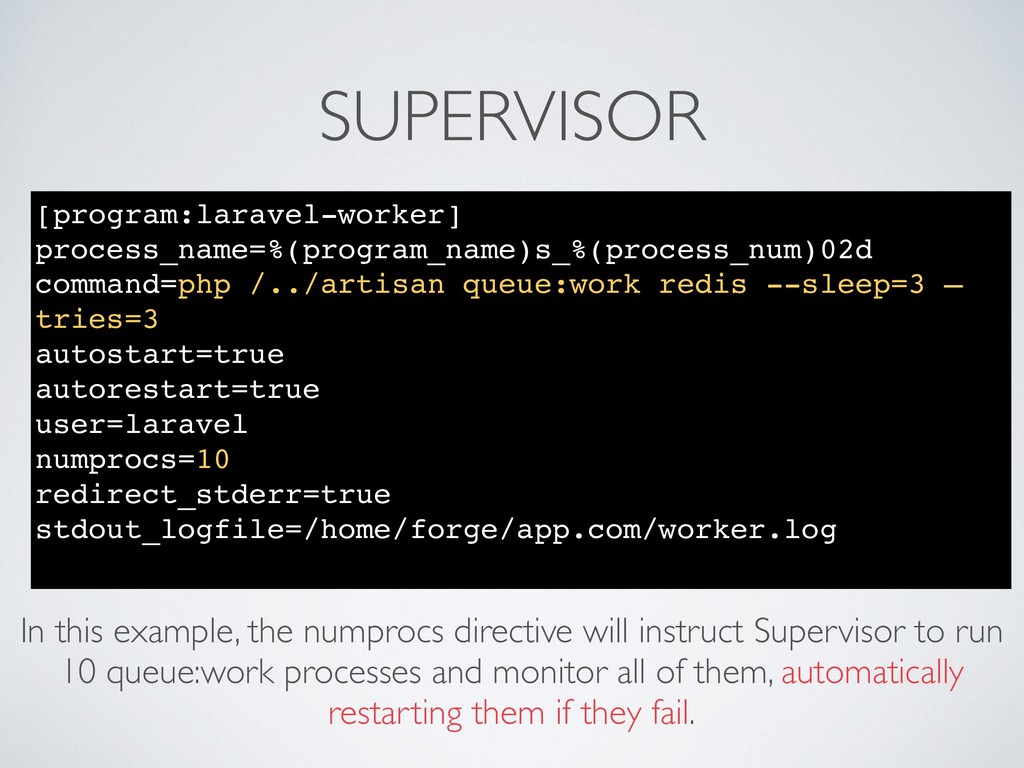 autostart=true autorestart=true user=laravel numprocs=10 redirect_stderr=true stdout_logfile=/home/forge/app.com/worker.log In this example, the numprocs directive will instruct Supervisor to run 10 queue:work processes and monitor all of them, automatically restarting them if they fail.