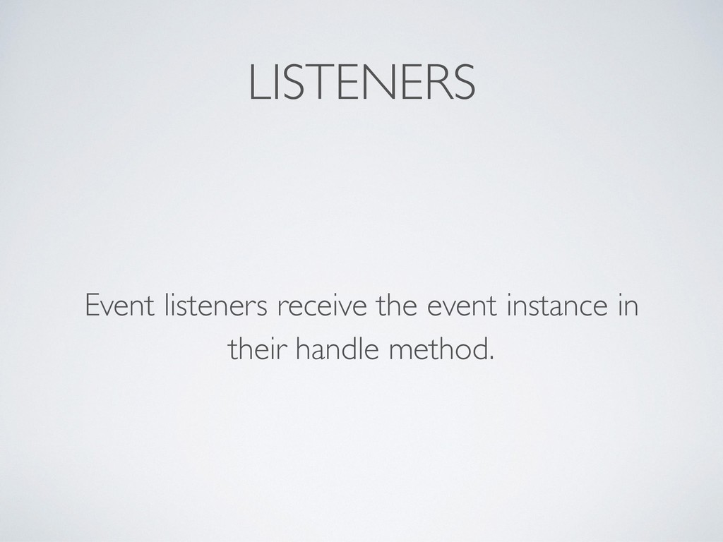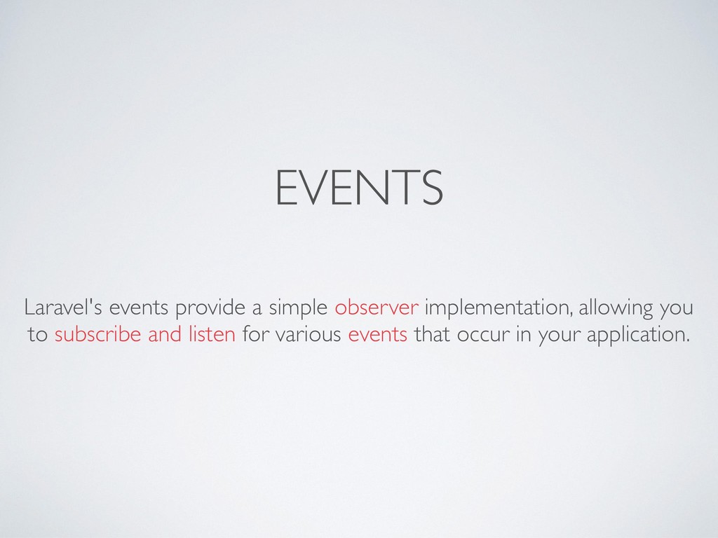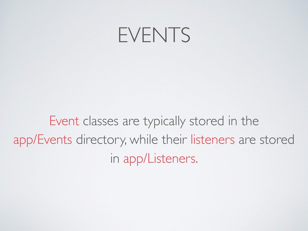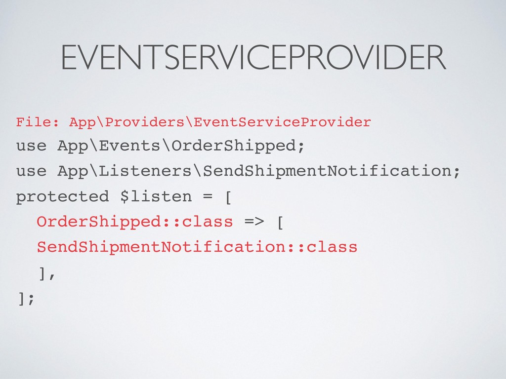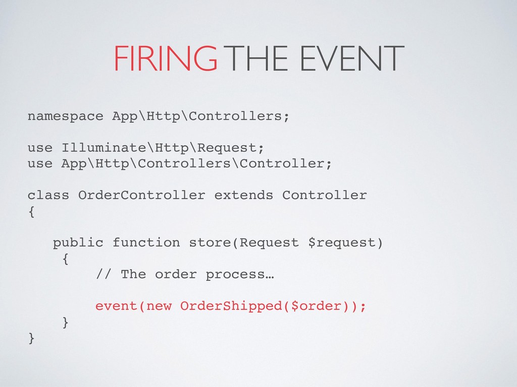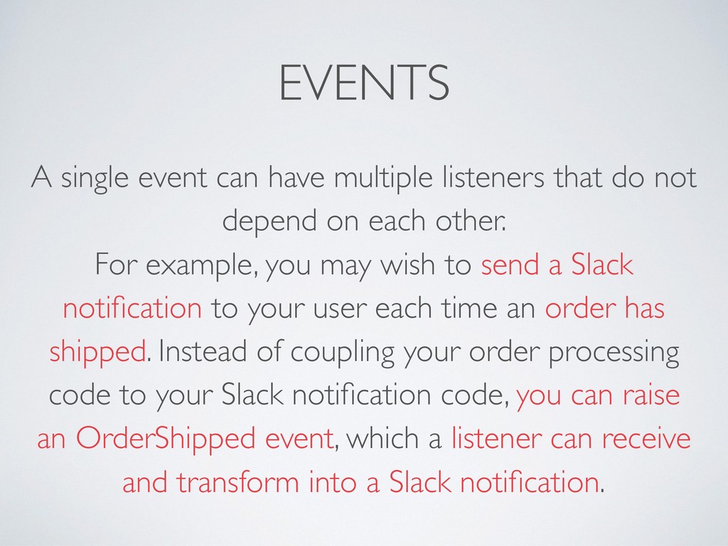not depend on each other. For example, you may wish to send a Slack notification to your user each time an order has shipped. Instead of coupling your order processing code to your Slack notification code, you can raise an OrderShipped event, which a listener can receive and transform into a Slack notification.
