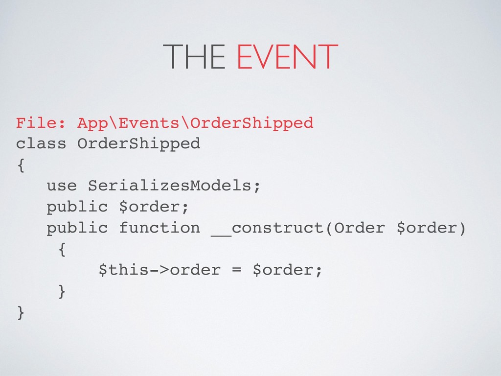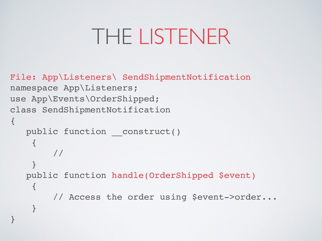 class SendShipmentNotification { public function __construct() { // } public function handle(OrderShipped $event) { // Access the order using $event->order... } }