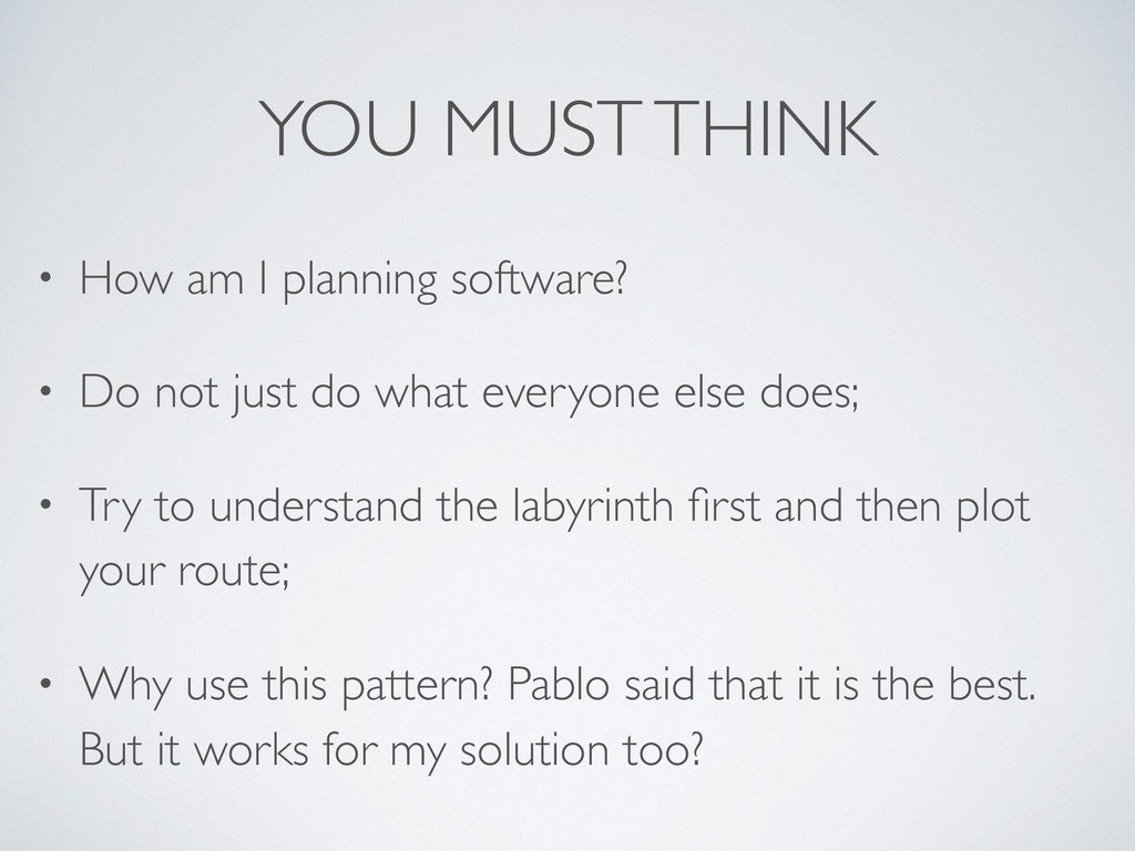 Do not just do what everyone else does; • Try to understand the labyrinth first and then plot your route; • Why use this pattern? Pablo said that it is the best. But it works for my solution too?