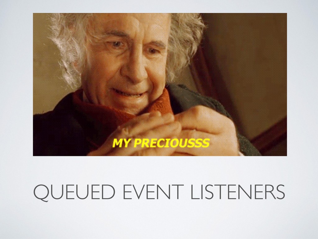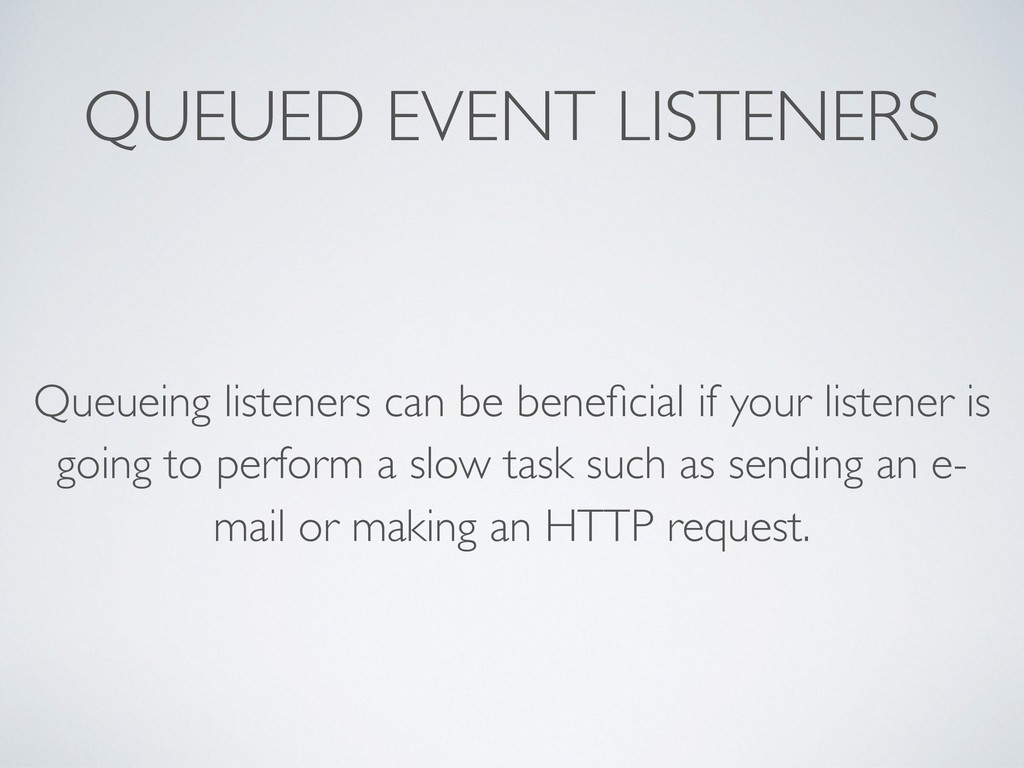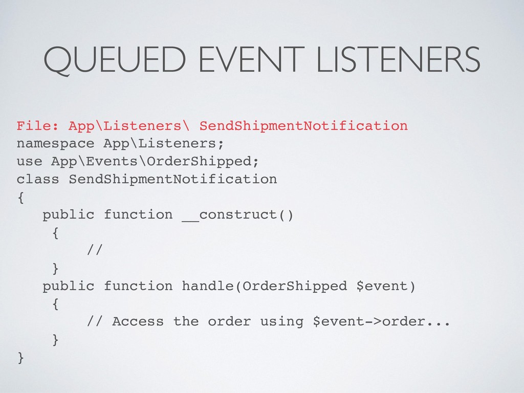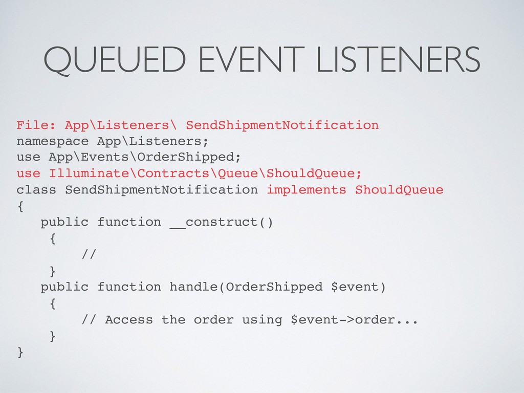 use Illuminate\Contracts\Queue\ShouldQueue; class SendShipmentNotification implements ShouldQueue { public function __construct() { // } public function handle(OrderShipped $event) { // Access the order using $event->order... } }