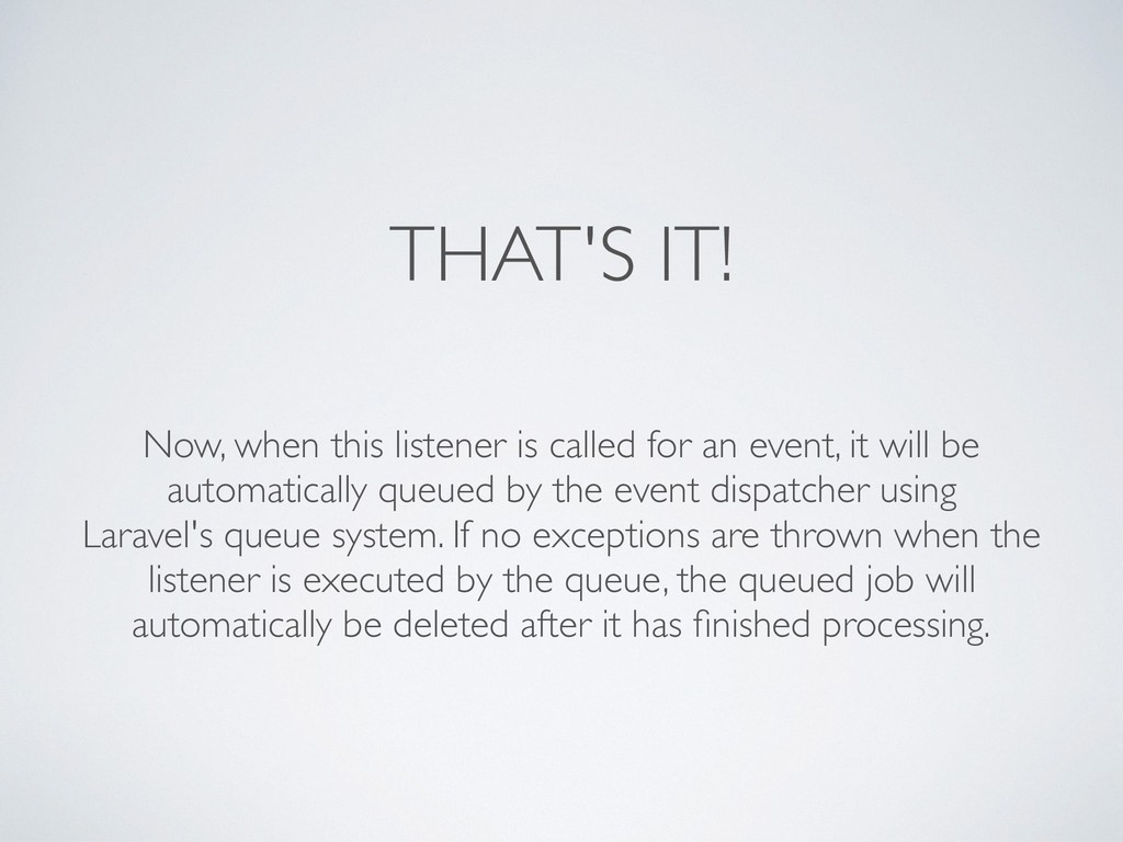 event, it will be automatically queued by the event dispatcher using Laravel's queue system. If no exceptions are thrown when the listener is executed by the queue, the queued job will automatically be deleted after it has finished processing.