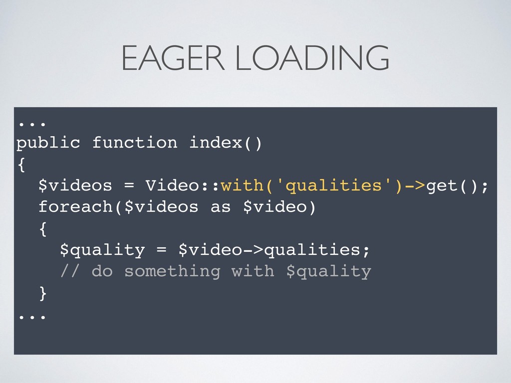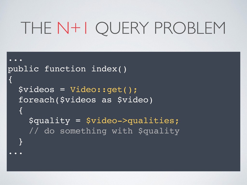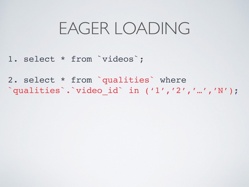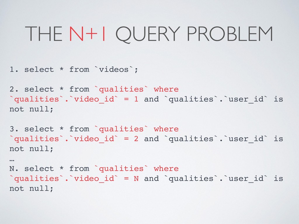 select * from `qualities` where `qualities`.`video_id` = 1 and `qualities`.`user_id` is not null; 3. select * from `qualities` where `qualities`.`video_id` = 2 and `qualities`.`user_id` is not null; … N. select * from `qualities` where `qualities`.`video_id` = N and `qualities`.`user_id` is not null;