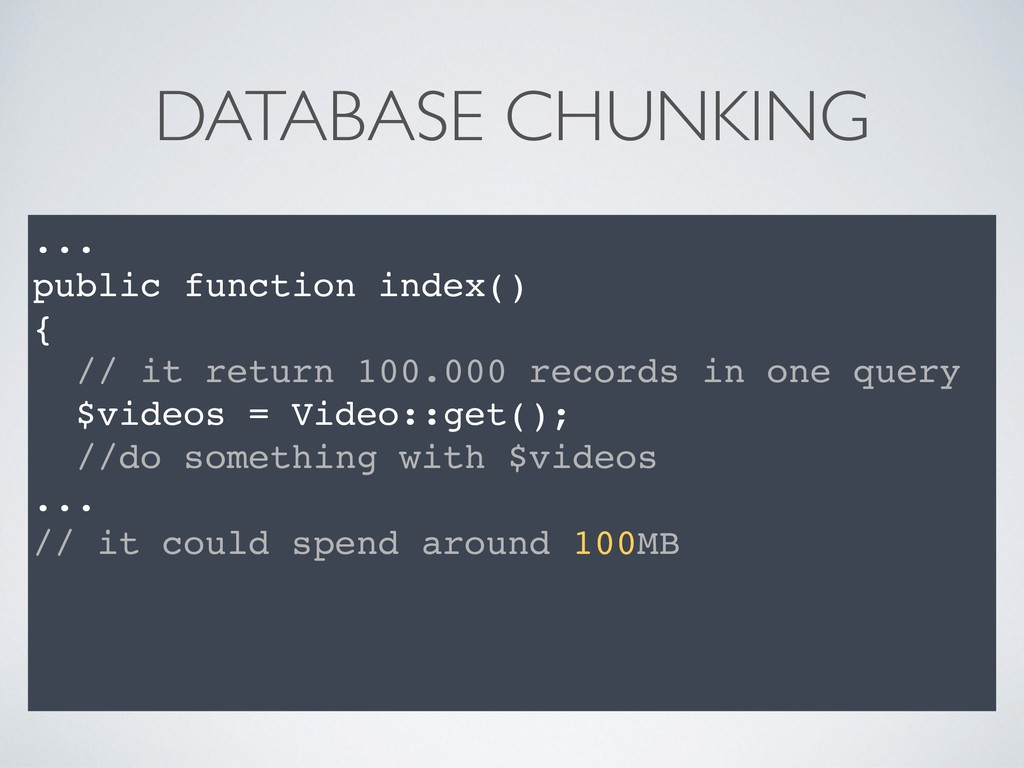 10.000 records per query (10) Video::chunk(10000, function($videos) { //do something with $videos }); … // it could spend around 10MB This method is very useful for writing Artisan commands that process thousands of records.