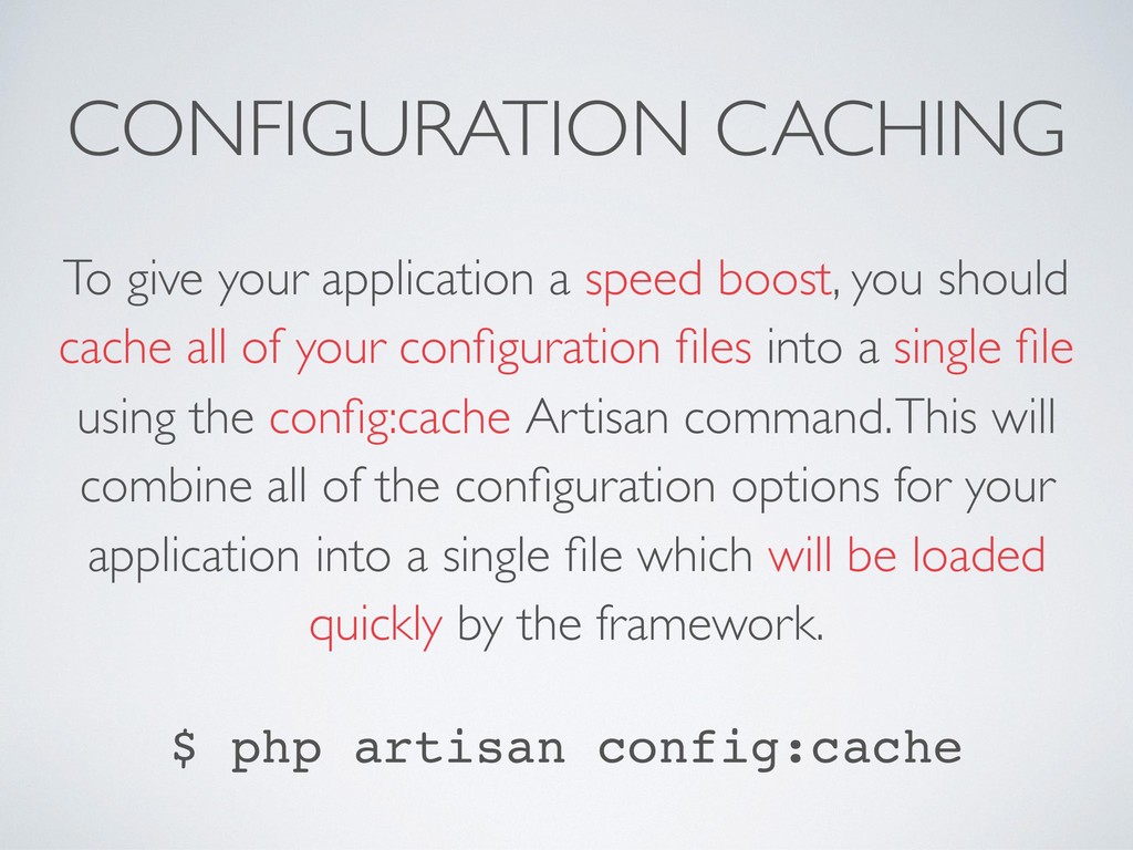 should cache all of your configuration files into a single file using the config:cache Artisan command. This will combine all of the configuration options for your application into a single file which will be loaded quickly by the framework. $ php artisan config:cache