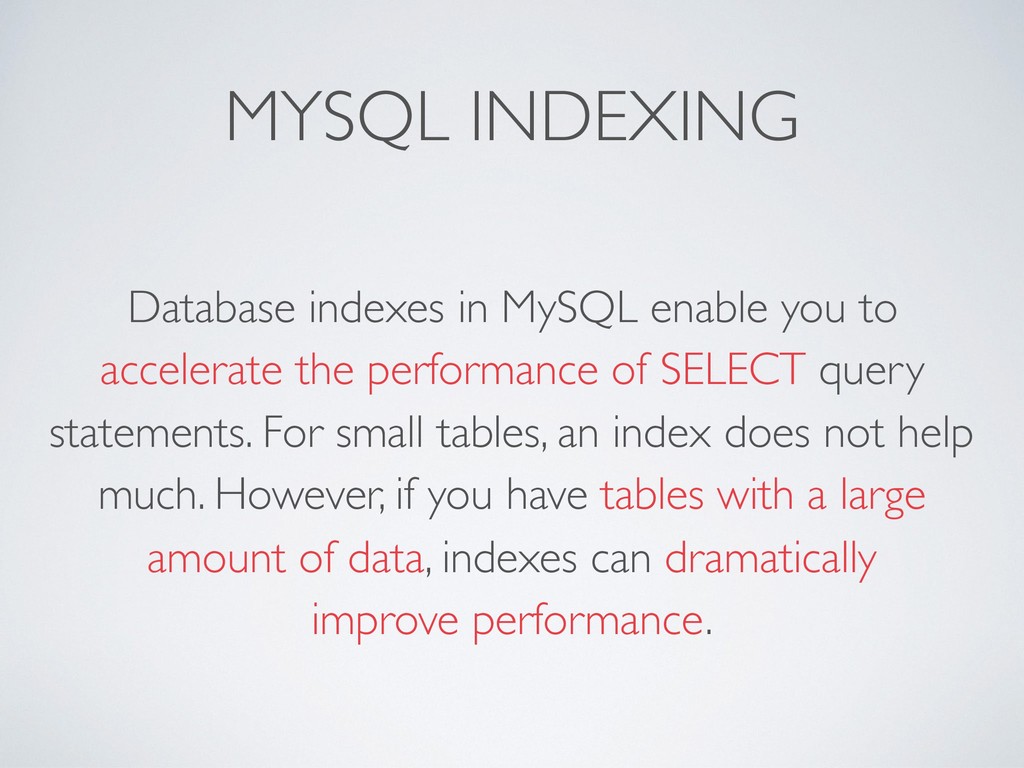 the performance of SELECT query statements. For small tables, an index does not help much. However, if you have tables with a large amount of data, indexes can dramatically improve performance.