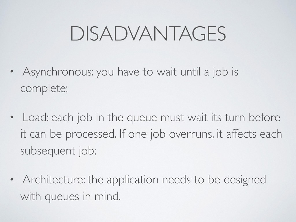 is complete; • Load: each job in the queue must wait its turn before it can be processed. If one job overruns, it affects each subsequent job; • Architecture: the application needs to be designed with queues in mind.