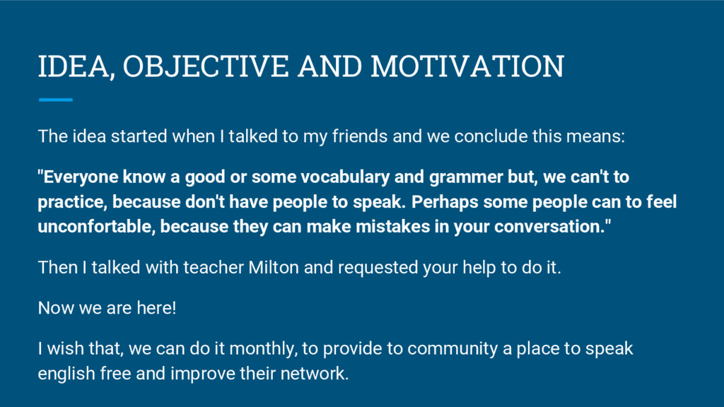 I wish that, we can do it monthly, to provide to community a place to speak english free and improve their network.