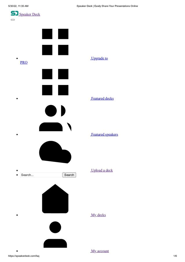 Online https://speakerdeck.com/faq 2/6 Frequently Asked Questions How do I report a bug, ask for help, or give you a high-five? How do I sign up for Speaker Deck? How do I upload a deck? How do I share a deck? How do I disallow downloads of my decks? How do I hide Speaker Deck branding? How do I use oEmbed to display a deck on my site? How many decks can I upload? How large of a deck can I upload? Why does my deck look low quality? What happens if I follow another user? What file types do you support? There is a deck that violates the Terms of Service, what should I do? Someone is using my copyrighted material without permission, what should I do? How do I report a bug, ask for help, or give you a high-five? Send an email to [email protected]. Upgrade to PRO My stars Sign out My decks My account Upgrade to PRO My stars Feedback Sign out