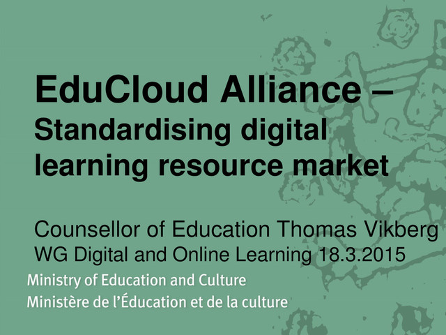 Ministry of Education and Culture – Companies (eg. publishers, platform providers, ict compan – Universities – Non-profit organisations • Jointly agree on a de facto standard (ECA) to provide interoperability • Joint collaboration with Estonia – Memorandum of Understanding signed in Jan. 2014