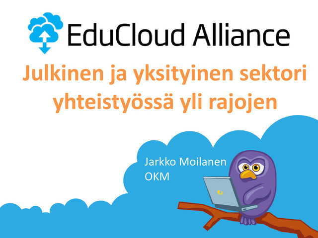 • OKM:n ja Ministeri Kiurun vahva rooli - ”konsortion” kokoonkutsujana • Sateenvarjoksi COSS – Suomen avoimien tietojärjestelmien keskus – Konsortion rakennusvastuu, sopimukset osapuolten kanssa • Vetovastuu pitkälti teknisessä kehityksessä ollut vielä OKM:llä • Win-win mallien etsimistä, kaikkien kuuleminen educloudalliance.org 20.11.2014, Mikkeli