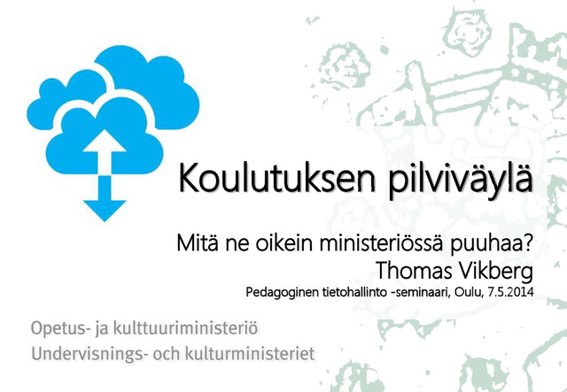 hankintaan, saatavuuteen ja käyttöönottoon kouluissa. Tavoite vuodelle 2014: vuoden loppupuolella konkreettista näytettävää ja kokeiltavaa Kehitys tehdään ketterästi iteroiden Koulutuksen pilviväylän tarkoitus ja tavoite ja toimintatapa
