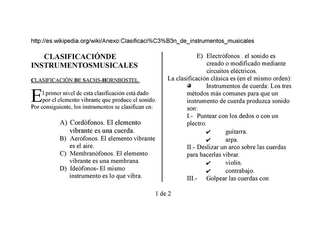 ORNBOSTEL. l primer nivel de esta clasificación está dado por el elemento vibrante que produce el sonido. Por consiguiente, los instrumentos se clasifican en: E A) Cordófonos. El elemento vibrante es una cuerda. B) Aerófonos. El elemento vibrante es el aire. C) Membranófonos. El elemento vibrante es una membrana. D) Ideófonos- El mismo instrumento es lo que vibra. E) Electrófonos . el sonido es creado o modificado mediante circuitos eléctricos. La clasificación clásica es (en el mismo orden): Instrumentos de cuerda: Los tres métodos más comunes para que un instrumento de cuerda produzca sonido son: I.- Puntear con los dedos o con un plectro. ✔ guitarra. ✔ arpa. II.- Deslizar un arco sobre las cuerdas para hacerlas vibrar. ✔ violín. ✔ contrabajo. III.- Golpear las cuerdas con 1 de 2