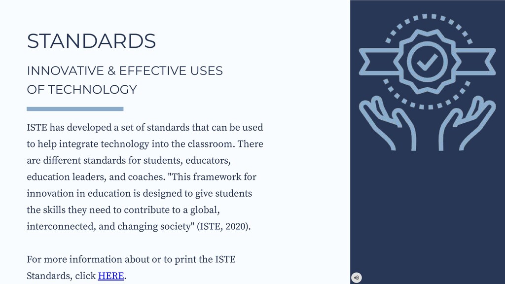 used to help integrate technology into the classroom. There are different standards for students, educators, education leaders, and coaches. "This framework for innovation in education is designed to give students the skills they need to contribute to a global, interconnected, and changing society" (ISTE, 2020). For more information about or to print the ISTE Standards, click HERE. STANDARDS INNOVATIVE & EFFECTIVE USES OF TECHNOLOGY