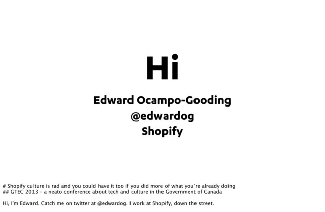 and you could have it too if you did more of what you’re already doing ## GTEC 2013 – a neato conference about tech and culture in the Government of Canada Hi, I'm Edward. Catch me on twitter at @edwardog. I work at Shopify, down the street.