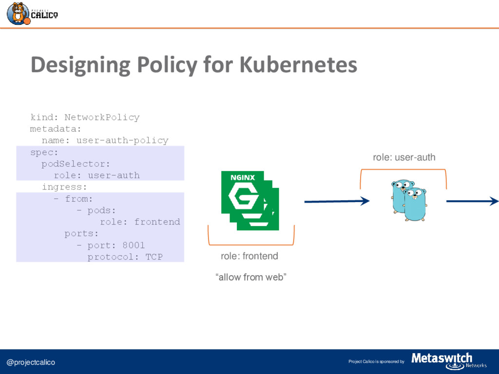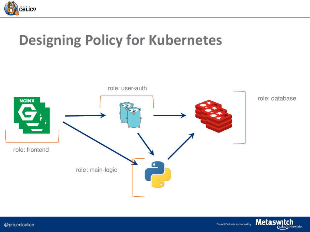role: frontend role: user-auth role: main-logic role: database “allow from web to TCP 80” “allow from role: frontend” “allow from role: user-auth” “allow from role: user-auth” “allow from role: main-logic” “allow from role: frontend”