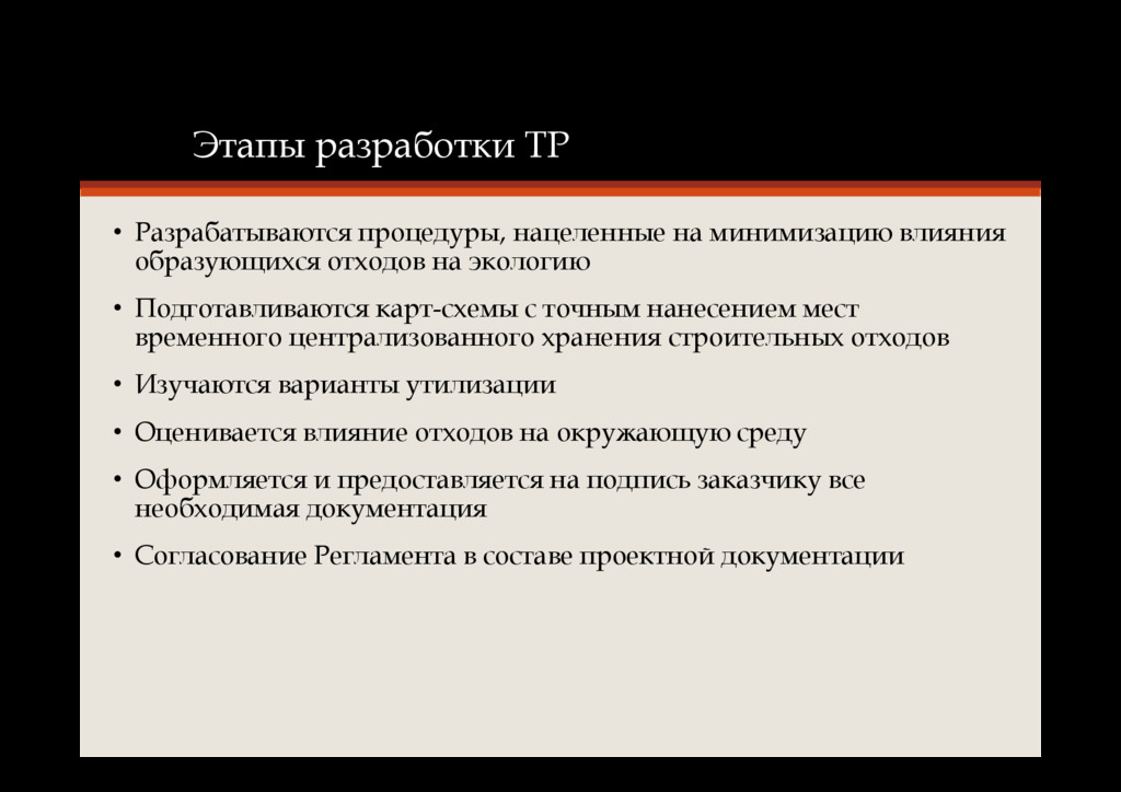 образующихся отходов на экологию • Подготавливаются карт-схемы с точным нанесением мест временного централизованного хранения строительных отходов • Изучаются варианты утилизации • Оценивается влияние отходов на окружающую среду • Оформляется и предоставляется на подпись заказчику все необходимая документация • Согласование Регламента в составе проектной документации