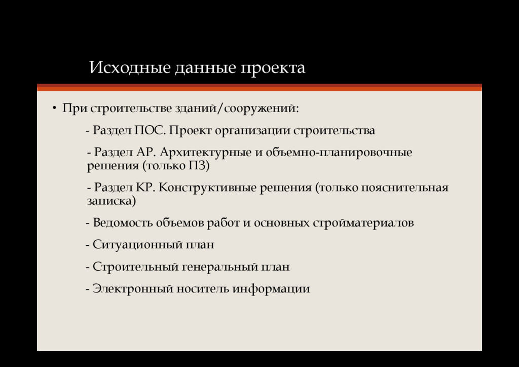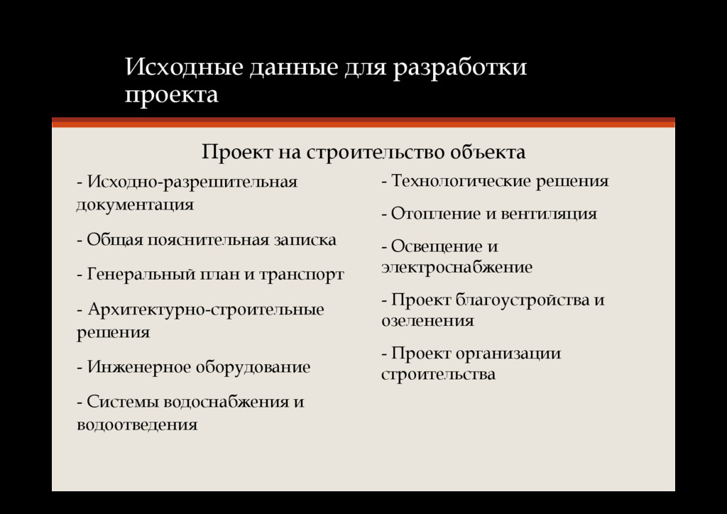 задание на проектирование объекта • Материалы инженерных изысканий (при реконструкции объектов - материалы их предпроектного технического обследования) • Решения по применению материалов, механизмов и ресурсов • Сведения об условиях поставки строительных конструкций, изделий и оборудования • Объемно-планировочные и конструктивные решения объектов и принципиальные технологические схемы строительства