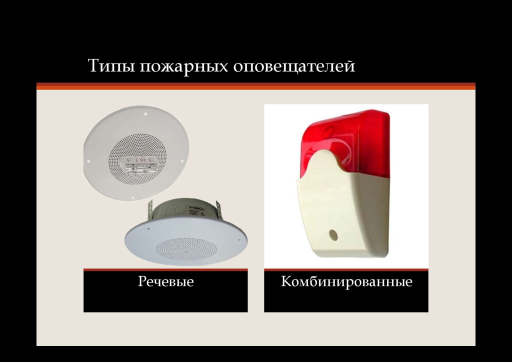 (сирена, тонированный сигнал и др.), световой (световые мигающие оповещатели, световые оповещатели «Выход») • 2 тип - звуковой, световой (световые мигающие оповещатели, световые оповещатели «Выход», эвакуационные знаки пожарной безопасности, указывающие направление движения) • 3 тип - звуковой, речевой (передача специальных текстов), световой (световые мигающие оповещатели, световые оповещатели «Выход», эвакуационные знаки пожарной безопасности, указывающие направление движения); разделение здания на зоны пожарного оповещения; обратная связь зон пожарного оповещения с помещением пожарного поста-диспетчерской.
