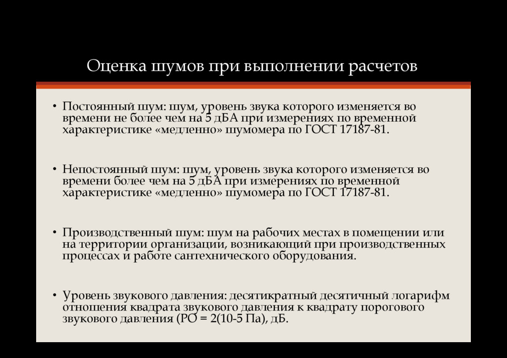 звука которого изменяется во времени не более чем на 5 дБА при измерениях по временной характеристике «медленно» шумомера по ГОСТ 17187-81. • Непостоянный шум: шум, уровень звука которого изменяется во времени более чем на 5 дБА при измерениях по временной характеристике «медленно» шумомера по ГОСТ 17187-81. • Производственный шум: шум на рабочих местах в помещении или на территории организации, возникающий при производственных процессах и работе сантехнического оборудования. • Уровень звукового давления: десятикратный десятичный логарифм отношения квадрата звукового давления к квадрату порогового звукового давления (РО = 2(10-5 Па), дБ.