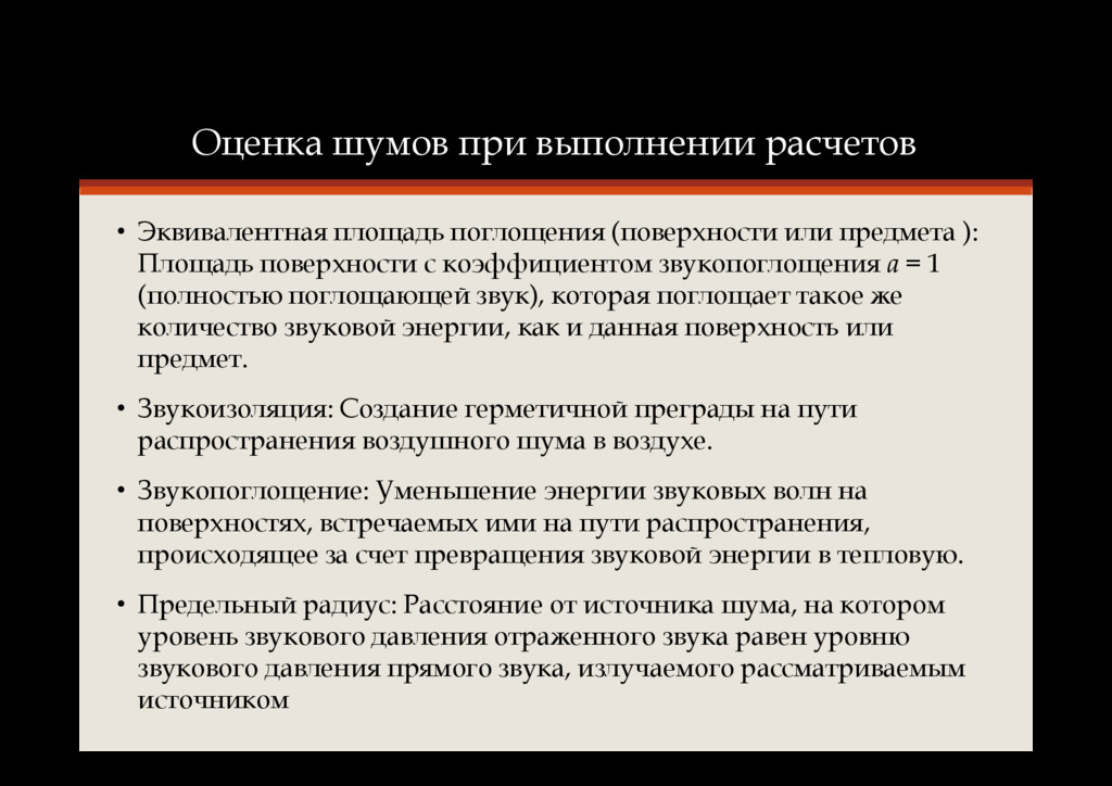 или предмета ): Площадь поверхности с коэффициентом звукопоглощения а = 1 (полностью поглощающей звук), которая поглощает такое же количество звуковой энергии, как и данная поверхность или предмет. • Звукоизоляция: Создание герметичной преграды на пути распространения воздушного шума в воздухе. • Звукопоглощение: Уменьшение энергии звуковых волн на поверхностях, встречаемых ими на пути распространения, происходящее за счет превращения звуковой энергии в тепловую. • Предельный радиус: Расстояние от источника шума, на котором уровень звукового давления отраженного звука равен уровню звукового давления прямого звука, излучаемого рассматриваемым источником