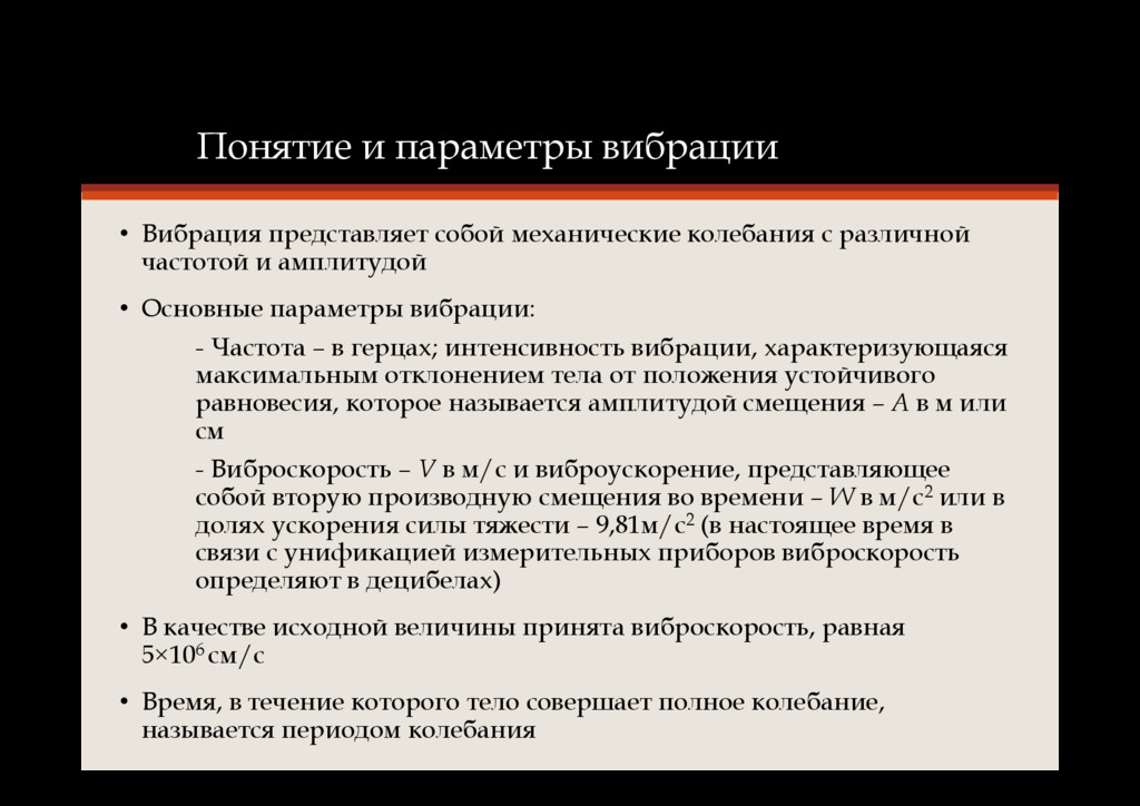с различной частотой и амплитудой • Основные параметры вибрации: - Частота – в герцах; интенсивность вибрации, характеризующаяся максимальным отклонением тела от положения устойчивого равновесия, которое называется амплитудой смещения – А в м или см - Виброскорость – V в м/с и виброускорение, представляющее собой вторую производную смещения во времени – W в м/с2 или в долях ускорения силы тяжести – 9,81м/с2 (в настоящее время в связи с унификацией измерительных приборов виброскорость определяют в децибелах) • В качестве исходной величины принята виброскорость, равная 5×106 см/с • Время, в течение которого тело совершает полное колебание, называется периодом колебания
