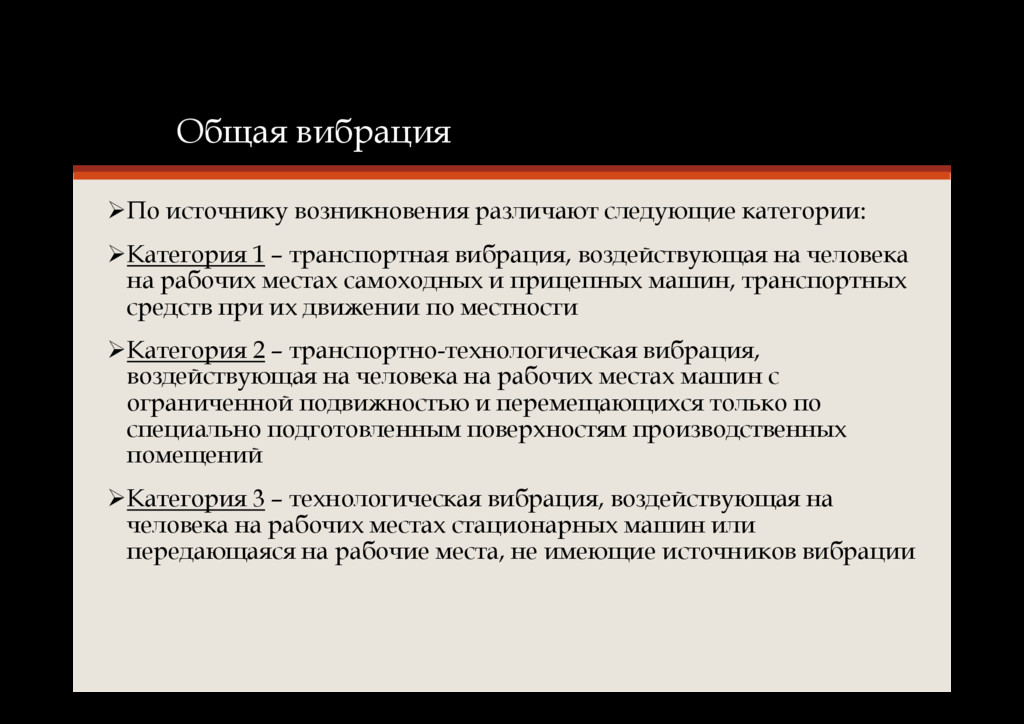– транспортная вибрация, воздействующая на человека на рабочих местах самоходных и прицепных машин, транспортных средств при их движении по местности Категория 2 – транспортно-технологическая вибрация, воздействующая на человека на рабочих местах машин с ограниченной подвижностью и перемещающихся только по специально подготовленным поверхностям производственных помещений Категория 3 – технологическая вибрация, воздействующая на человека на рабочих местах стационарных машин или передающаяся на рабочие места, не имеющие источников вибрации