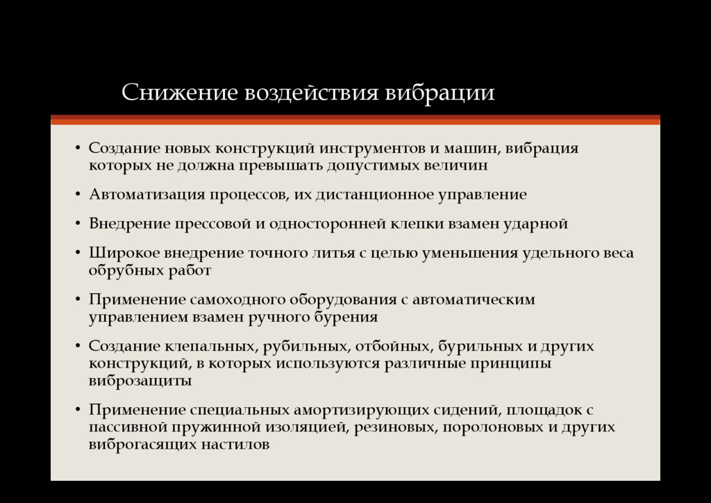 вибрация которых не должна превышать допустимых величин • Автоматизация процессов, их дистанционное управление • Внедрение прессовой и односторонней клепки взамен ударной • Широкое внедрение точного литья с целью уменьшения удельного веса обрубных работ • Применение самоходного оборудования с автоматическим управлением взамен ручного бурения • Создание клепальных, рубильных, отбойных, бурильных и других конструкций, в которых используются различные принципы виброзащиты • Применение специальных амортизирующих сидений, площадок с пассивной пружинной изоляцией, резиновых, поролоновых и других виброгасящих настилов