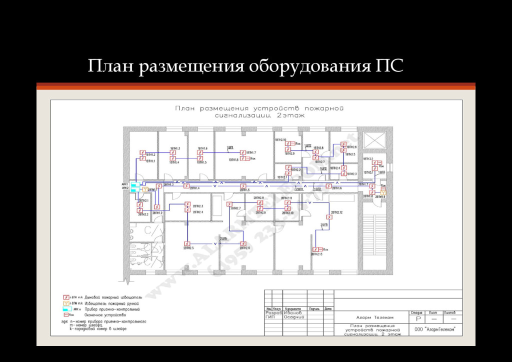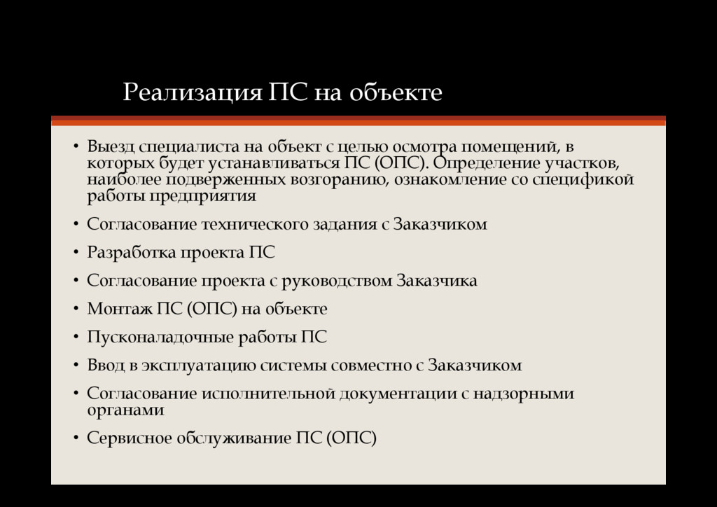 целью осмотра помещений, в которых будет устанавливаться ПС (ОПС). Определение участков, наиболее подверженных возгоранию, ознакомление со спецификой работы предприятия • Согласование технического задания с Заказчиком • Разработка проекта ПС • Согласование проекта с руководством Заказчика • Монтаж ПС (ОПС) на объекте • Пусконаладочные работы ПС • Ввод в эксплуатацию системы совместно с Заказчиком • Согласование исполнительной документации с надзорными органами • Сервисное обслуживание ПС (ОПС)