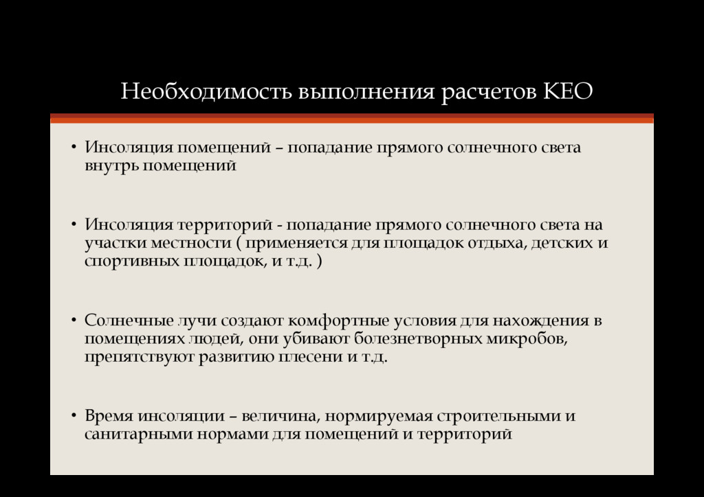 разделом в составе предпроектной и проектной документации • Расчет КЕО (коэффициент естественного освещения) является необходимой согласуемой составляющей любого проекта перепланировки помещения • Этим расчетом подтверждается, что перепланировка не повлечет за собой уменьшение периода освещения ниже нормативного • Положительное заключение на материалы расчета инсоляции в составе проектной документации является основанием для выдачи Разрешения на производство строительно-монтажных работ
