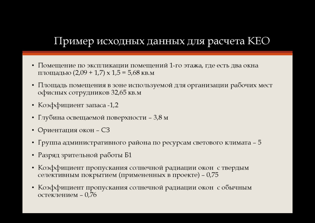 помещений 1-го этажа, где есть два окна площадью (2,09 + 1,7) х 1,5 = 5,68 кв.м • Площадь помещения в зоне используемой для организации рабочих мест офисных сотрудников 32,65 кв.м • Коэффициент запаса -1,2 • Глубина освещаемой поверхности – 3,8 м • Ориентация окон – СЗ • Группа административного района по ресурсам светового климата – 5 • Разряд зрительной работы Б1 • Коэффициент пропускания солнечной радиации окон с твердым селективным покрытием (примененных в проекте) – 0,75 • Коэффициент пропускания солнечной радиации окон с обычным остеклением – 0,76