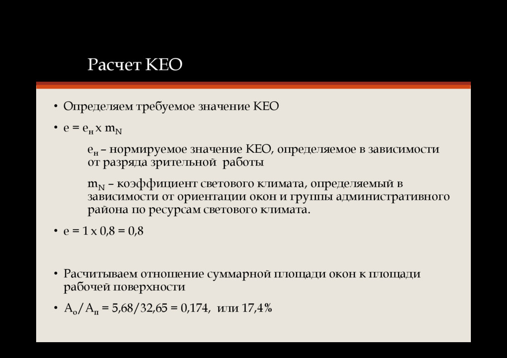 ен х mN ен – нормируемое значение КЕО, определяемое в зависимости от разряда зрительной работы mN – коэффициент светового климата, определяемый в зависимости от ориентации окон и группы административного района по ресурсам светового климата. • е = 1 х 0,8 = 0,8 • Расчитываем отношение суммарной площади окон к площади рабочей поверхности • Ао /Ап = 5,68/32,65 = 0,174, или 17,4%