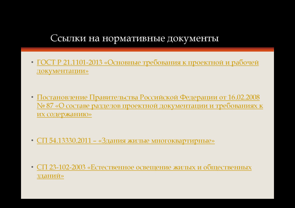 к проектной и рабочей документации» • Постановление Правительства Российской Федерации от 16.02.2008 № 87 «О составе разделов проектной документации и требованиях к их содержанию» • СП 54.13330.2011 – «Здания жилые многоквартирные» • СП 23-102-2003 «Естественное освещение жилых и общественных зданий»