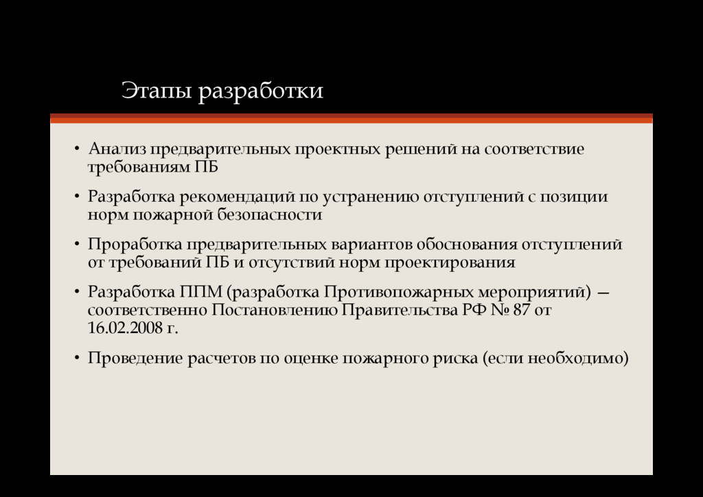 ПБ • Разработка рекомендаций по устранению отступлений с позиции норм пожарной безопасности • Проработка предварительных вариантов обоснования отступлений от требований ПБ и отсутствий норм проектирования • Разработка ППМ (разработка Противопожарных мероприятий) — соответственно Постановлению Правительства РФ № 87 от 16.02.2008 г. • Проведение расчетов по оценке пожарного риска (если необходимо)