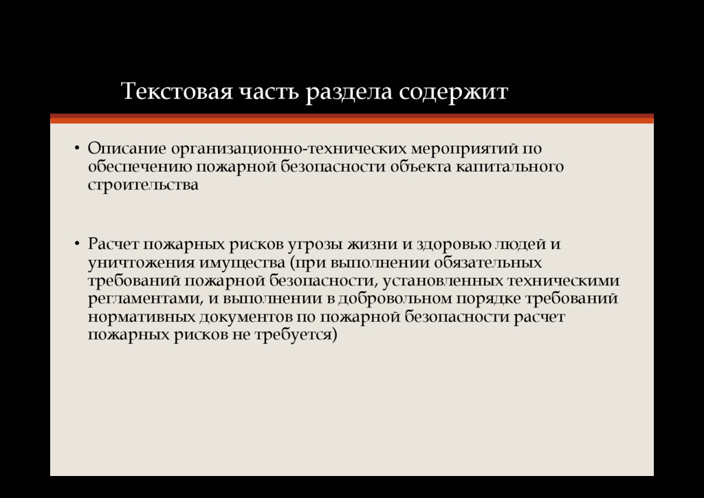 объекта капитального строительства • Расчет пожарных рисков угрозы жизни и здоровью людей и уничтожения имущества (при выполнении обязательных требований пожарной безопасности, установленных техническими регламентами, и выполнении в добровольном порядке требований нормативных документов по пожарной безопасности расчет пожарных рисков не требуется)