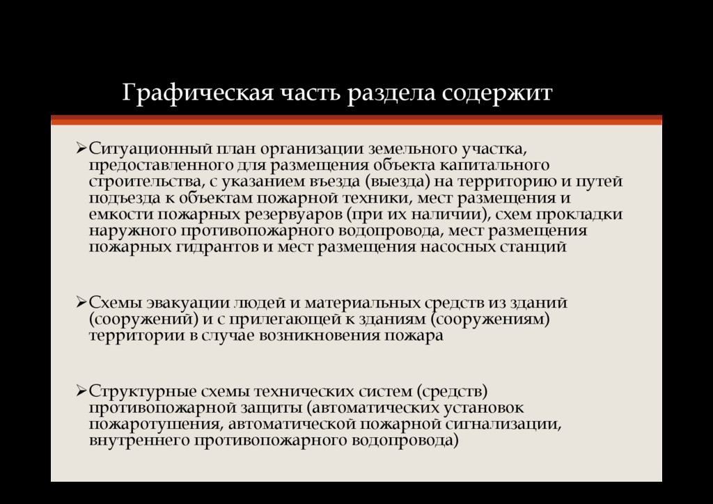объекта капитального строительства • Обоснование противопожарных расстояний между зданиями, сооружениями и наружными установками, обеспечивающих пожарную безопасность объектов капитального строительства • Описание и обоснование проектных решений по наружному противопожарному водоснабжению, по определению проездов и подъездов для пожарной техники • Описание и обоснование принятых конструктивных и объемно- планировочных решений, степени огнестойкости и класса конструктивной пожарной опасности строительных конструкций • Описание и обоснование проектных решений по обеспечению безопасности людей при возникновении пожара • Перечень мероприятий по обеспечению безопасности подразделений пожарной охраны при ликвидации пожара