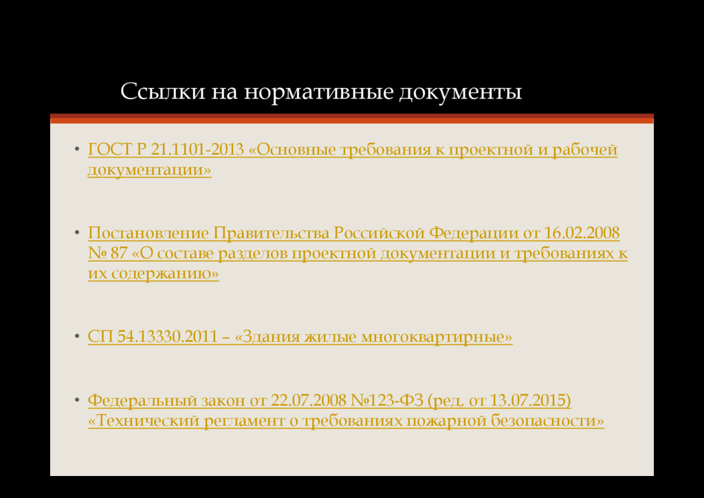 к проектной и рабочей документации» • Постановление Правительства Российской Федерации от 16.02.2008 № 87 «О составе разделов проектной документации и требованиях к их содержанию» • СП 54.13330.2011 – «Здания жилые многоквартирные»