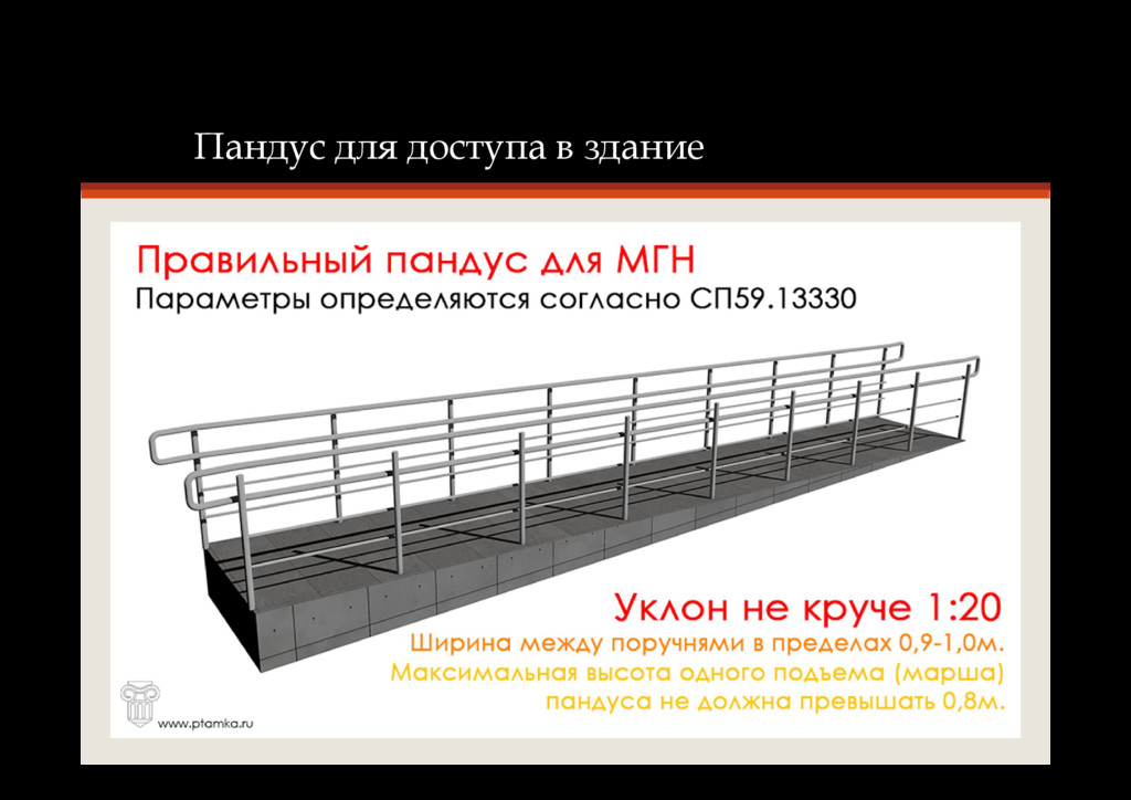 возможностями доступность и комфортное передвижение в современных зданиях и сооружениях • Предполагает организацию удобного расположения входных групп, коридоров, основных функциональных зон, путей передвижения инвалидов • Предполагает интеграцию специализированного оборудования и материалов, требуемых для применения маломобильными группами населения