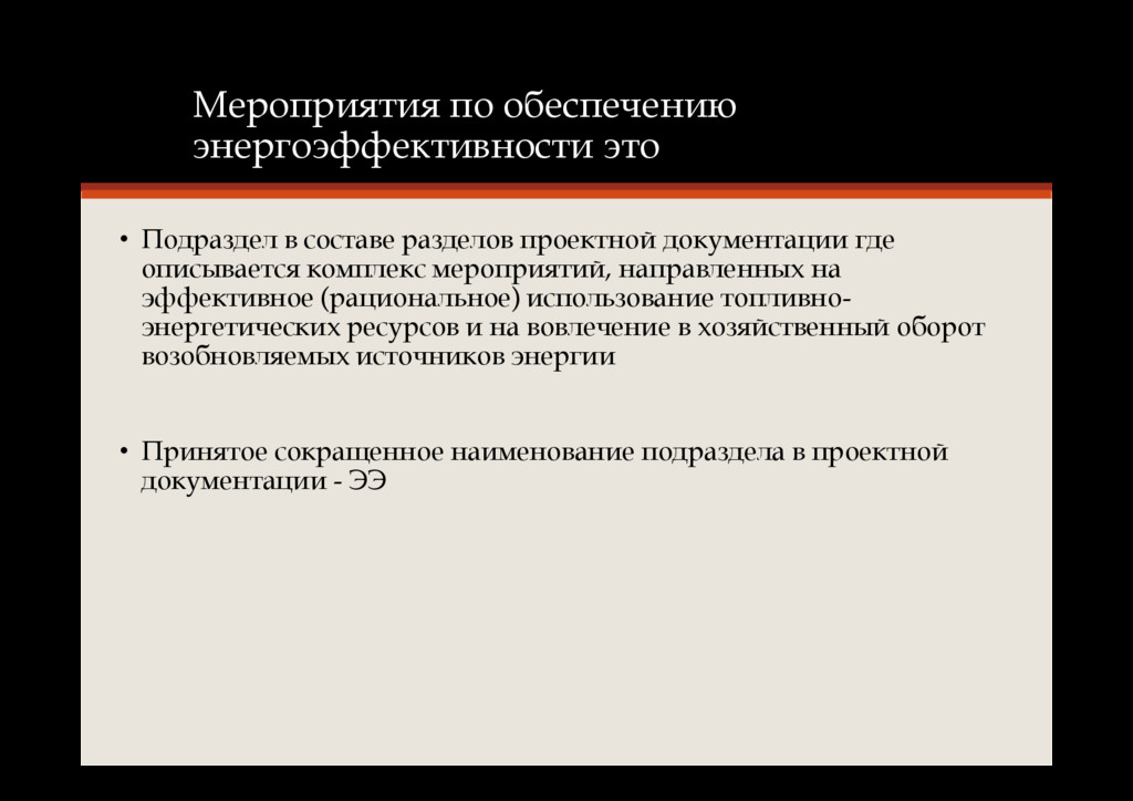 проектной документации где описывается комплекс мероприятий, направленных на эффективное (рациональное) использование топливно- энергетических ресурсов и на вовлечение в хозяйственный оборот возобновляемых источников энергии • Принятое сокращенное наименование подраздела в проектной документации - ЭЭ