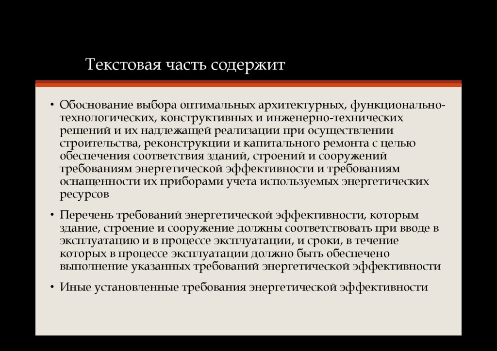 ресурсов в здании, строении и сооружении • Требования к архитектурным, функционально-технологическим, конструктивным и инженерно-техническим решениям, влияющим на энергетическую эффективность зданий, строений и сооружений • Требования к отдельным элементам, конструкциям зданий, строений и сооружений и их свойствам, к используемым в зданиях, строениях и сооружениях устройствам и технологиям, а также к включаемым в проектную документацию и применяемым при строительстве, реконструкции и капитальном ремонте зданий, строений и сооружений технологиям и материалам, позволяющие исключить нерациональный расход энергетических ресурсов как в процессе строительства, реконструкции и капитального ремонта зданий, строений и сооружений, так и в процессе их эксплуатации