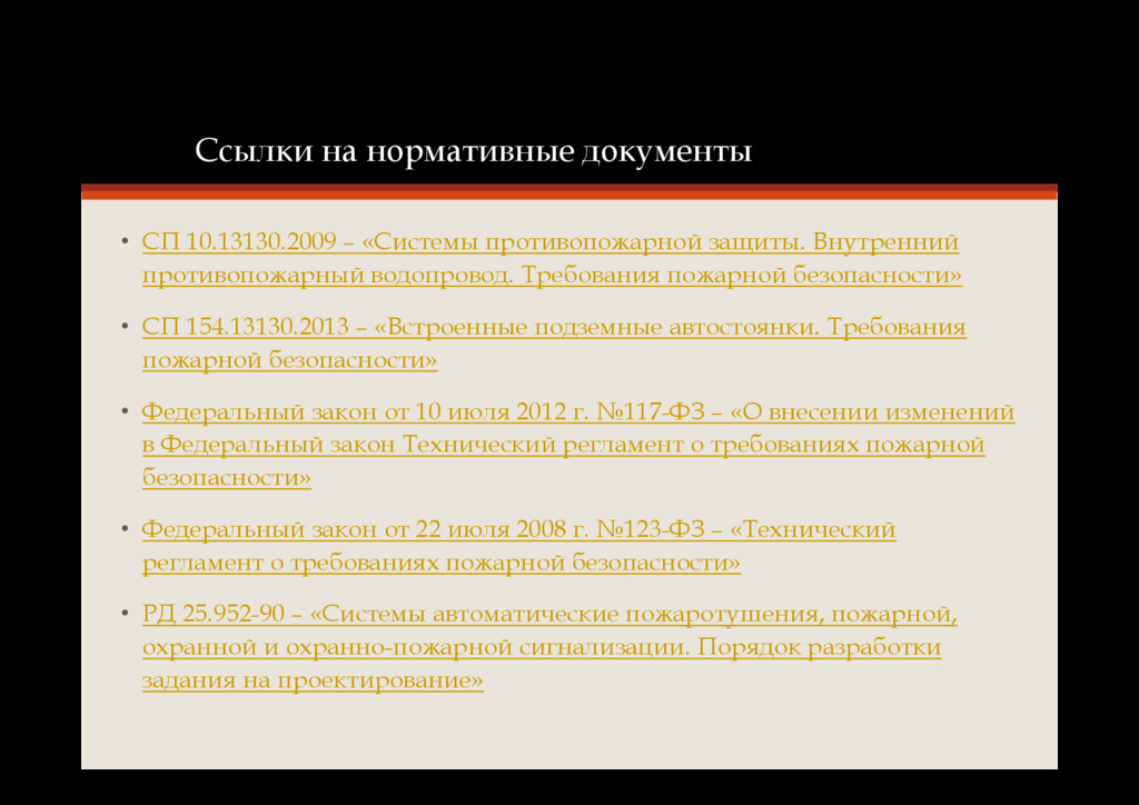 защиты. Внутренний противопожарный водопровод. Требования пожарной безопасности» • СП 154.13130.2013 – «Встроенные подземные автостоянки. Требования пожарной безопасности» • Федеральный закон от 10 июля 2012 г. №117-ФЗ – «О внесении изменений в Федеральный закон Технический регламент о требованиях пожарной безопасности» • Федеральный закон от 22 июля 2008 г. №123-ФЗ – «Технический регламент о требованиях пожарной безопасности» • РД 25.952-90 – «Системы автоматические пожаротушения, пожарной, охранной и охранно-пожарной сигнализации. Порядок разработки задания на проектирование»