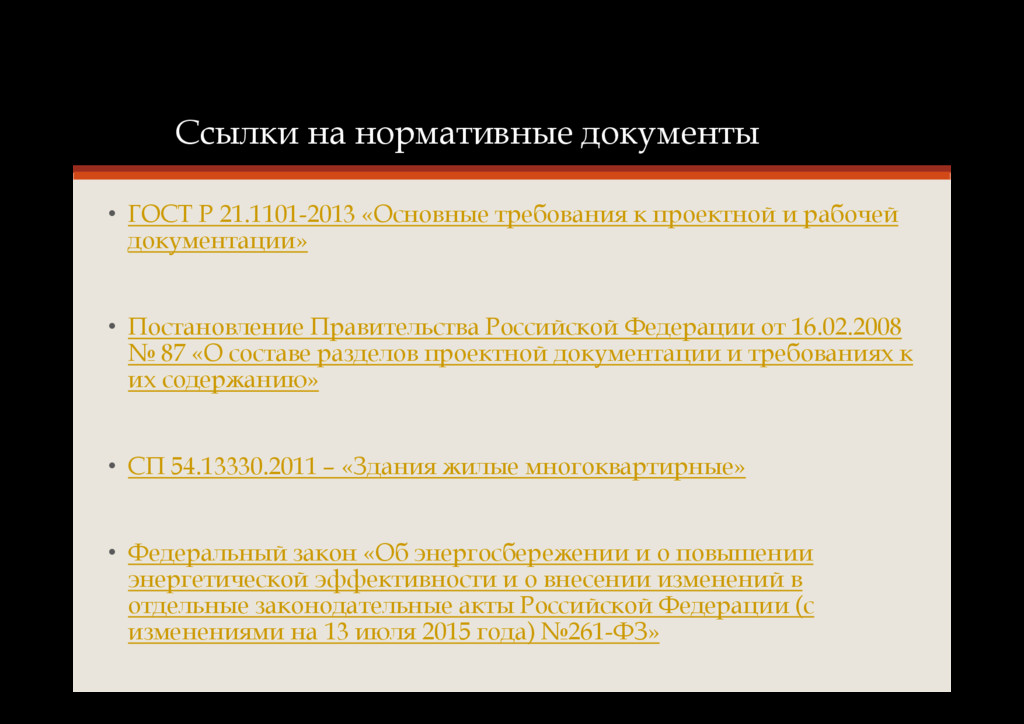 к проектной и рабочей документации» • Постановление Правительства Российской Федерации от 16.02.2008 № 87 «О составе разделов проектной документации и требованиях к их содержанию» • СП 54.13330.2011 – «Здания жилые многоквартирные» • Федеральный закон «Об энергосбережении и о повышении энергетической эффективности и о внесении изменений в отдельные законодательные акты Российской Федерации (с изменениями на 13 июля 2015 года) №261-ФЗ»