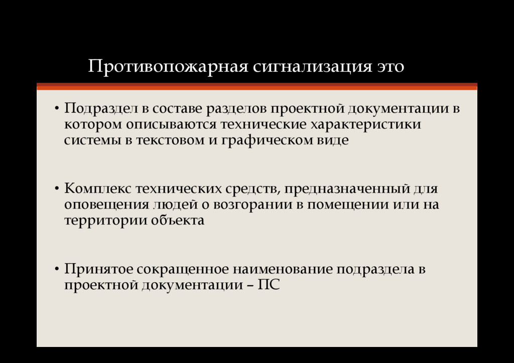 в котором описываются технические характеристики системы в текстовом и графическом виде • Комплекс технических средств, предназначенный для оповещения людей о возгорании в помещении или на территории объекта • Принятое сокращенное наименование подраздела в проектной документации – ПС