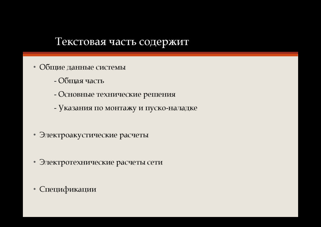 - Пояснительная записка - Спецификация оборудования и материалов - Электроакустические и электротехнические расчеты системы • Графическая часть проекта: - Принципиальные и функциональные схемы - Структурные схемы - Планы расположения оборудования и кабельных трасс - Схемы соединений и подключений