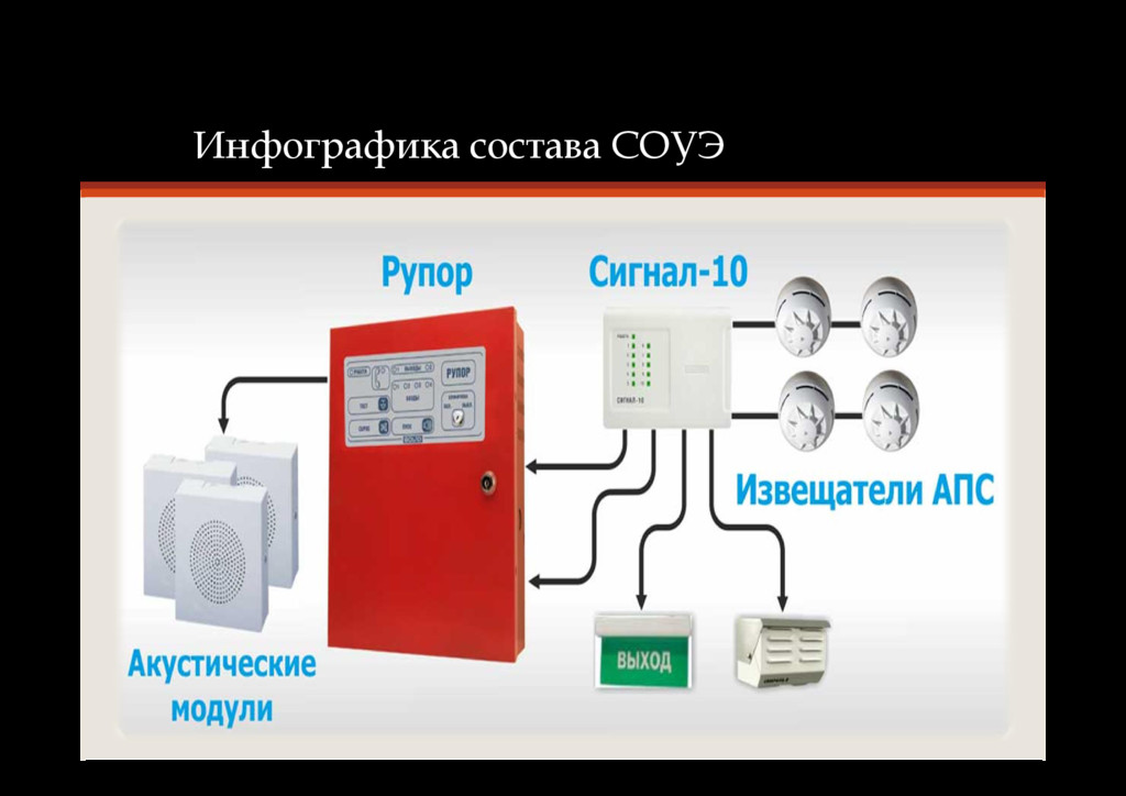 разделов проектной документации в котором описываются технические характеристики системы в текстовом и графическом виде • Одна из наиболее важных составляющих системы безопасности • Комплекс организационных мероприятий и технических средств, предназначенный для своевременного сообщения людям информации о возникновении пожара, необходимости эвакуироваться, путях и очередности эвакуации • Принятое сокращенное наименование подраздела в проектной документации - СОУЭ