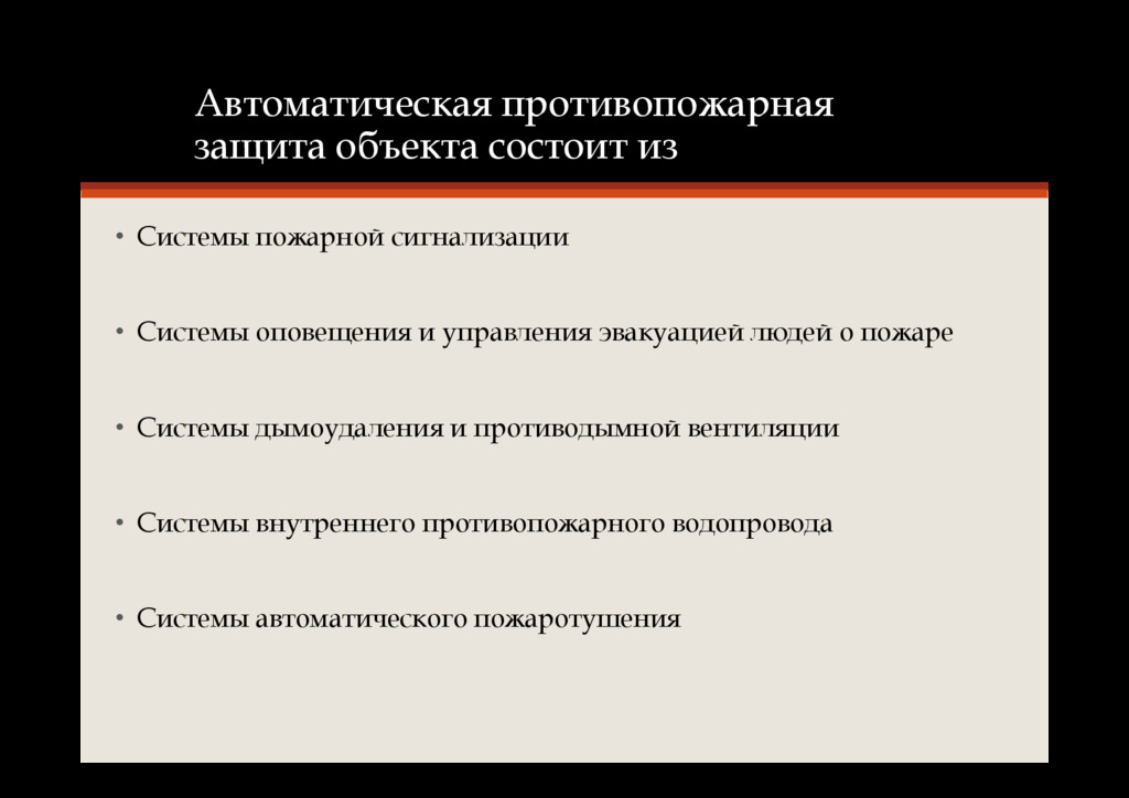 автоматического водяного и пенного пожаротушения, внутреннего противопожарного водопровода • Системы и установки автоматического газового и порошкового пожаротушения • Системы автоматической пожарной сигнализации • Системы управления инженерным оборудованием здания при пожаре • Системы оповещения людей при пожаре и ЧС